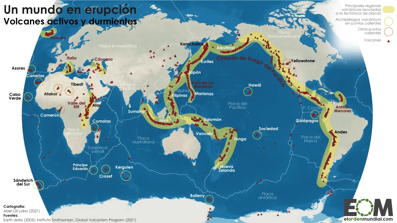 El Orden Mundial(A.Gil)/Quo(L.Landi) — El mapa de los volcanes del mundo está compuesto por más de 2.500 volcanes activos y durmientes. Es decir, por más de 2.500 volcanes que han entrado en erupción desde que acabó la última gran glaciación y se inició la era geológica del Holoceno, hace unos 10.000 años. Puede parecer mucho, pero en escala geológica supone un suspiro, y, aunque un volcán lleve cientos o miles de años sin entrar en erupción, esto no significa que no pueda reactivarse.
