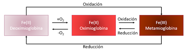 En la estructura de la mioglobina se encuentra un átomo de hierro en estado de oxidación +2 –Fe(II)–, encargado de enlazar a la molécula de O₂. A la estructura resultante se le denomina oximioglobina y presenta un color rojo muy vivo y atractivo para el consumidor.