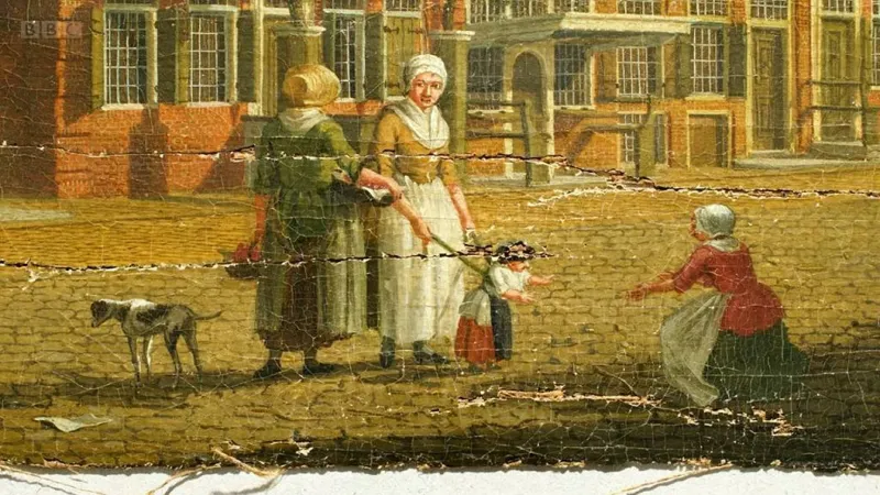 Detalle de ‘Nieuwstraat en Hoorn’ (1784) de Izaak Ouwater en el estado en el que fue devuelta al museo.