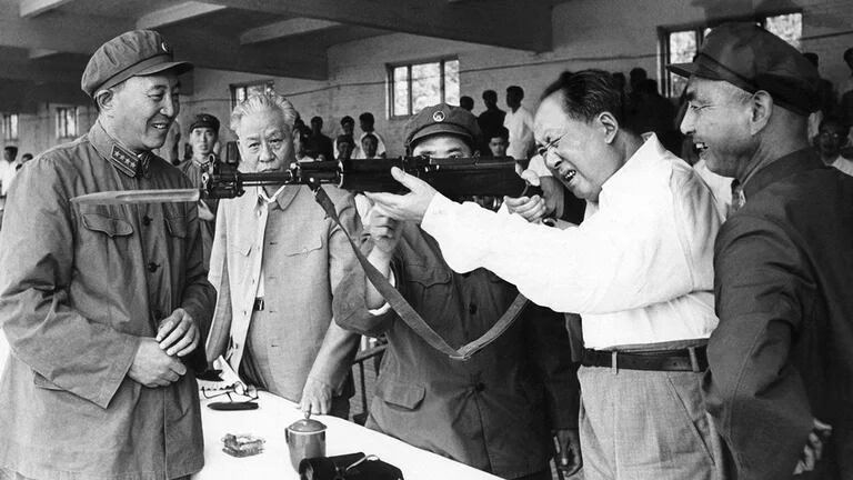 El líder comunista chino y presidente del Partido Comunista (PCCh) Mao Zedong examina un rifle semi-automático hecho en casa durante su visita a una exposición militar por las Unidades de Beijing del Ejército Popular de Liberación, en junio de 1964