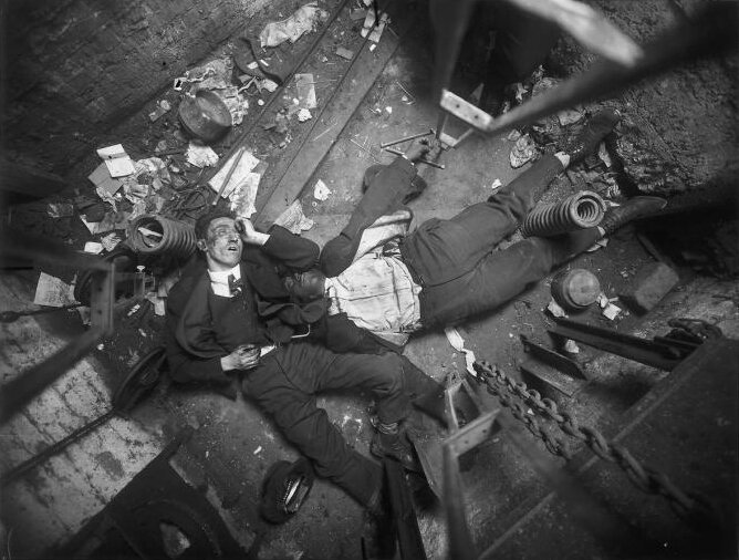 Un hombre tirado en la calle en Weegee es un muerto o un homeless tapado con cajas de cartón; en Brassaï se acerca más a un beodo que no llegó a su casa mientras la neblina del Senna comienza a cubrirlo.