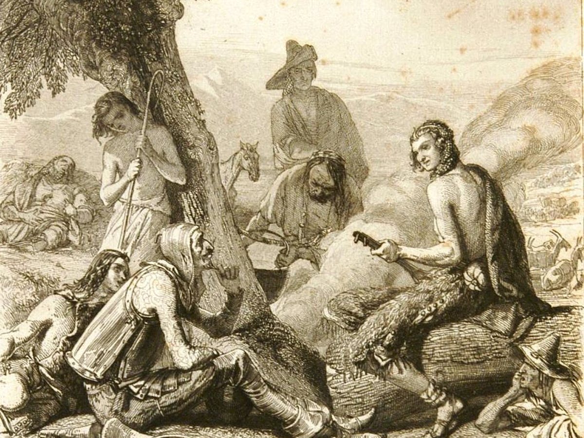 Grabado de Adolph Schrödter que retrata la hospitalidad de los cabreros con Don Quijote. Cervantes Virtual