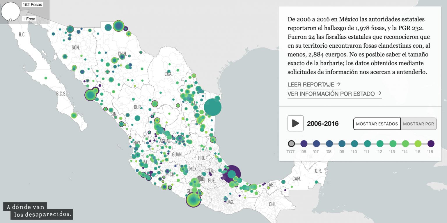 con el apoyo de quinto elemento lab, una red de periodistas ubicó en un mapa interactivo a más de 2000 fosas donde se enterraron a personas víctimas de la guerra contra las drogas del gobierno mexicano. recibieron el premio gabo 2019 en la categoría cobertura.