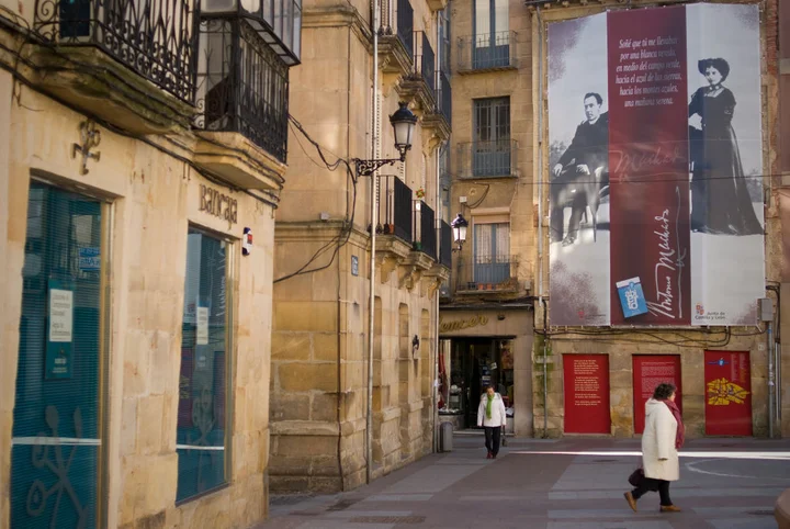 Un cartel de Machado y Leonor preside una calle de la ciudad de Soria.