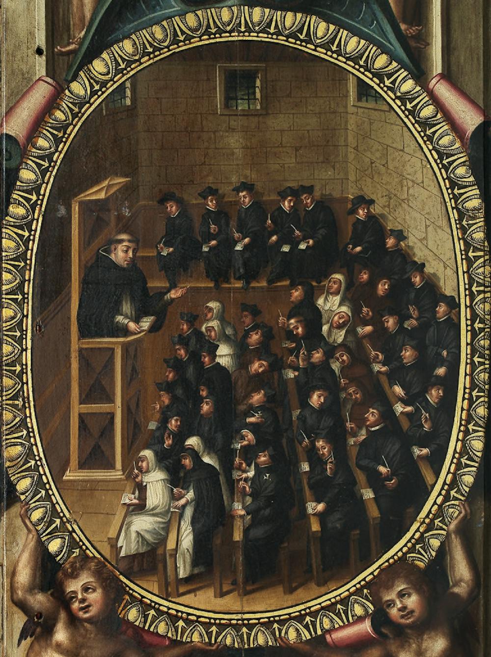 Versión pictórica de un aula antigua del Estudio salmantino con alumnos carmelitas, 1614. Universidad de Salamanca