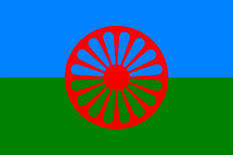 La bandera internacional del pueblo gitano representa el azul del cielo y el verde del campo. La rueda simboliza su estilo de vida nómada.