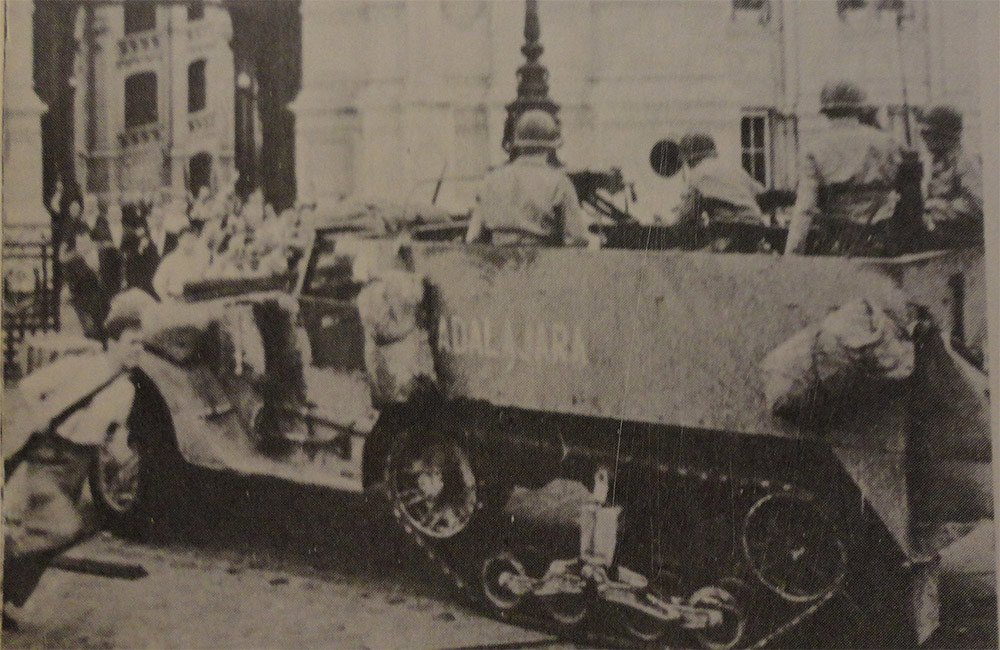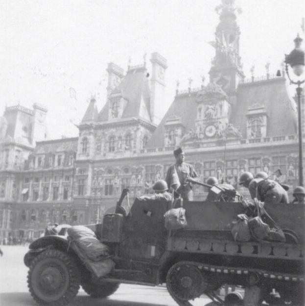 (Soldados españoles a bordo del semioruga «Guadalajara», estacionado ante el Ayuntamiento de París a las 21:20 horas del 24 de agosto de 1944)