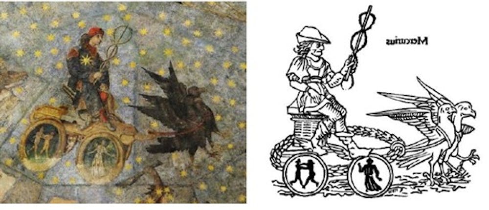 Es decir, el Sol está junto a Leo –su único domicilio–; Mercurio, en Virgo, una de sus dos casas (la nocturna); y en la rueda del carro aparecen pintadas ambas: Virgo y Géminis.