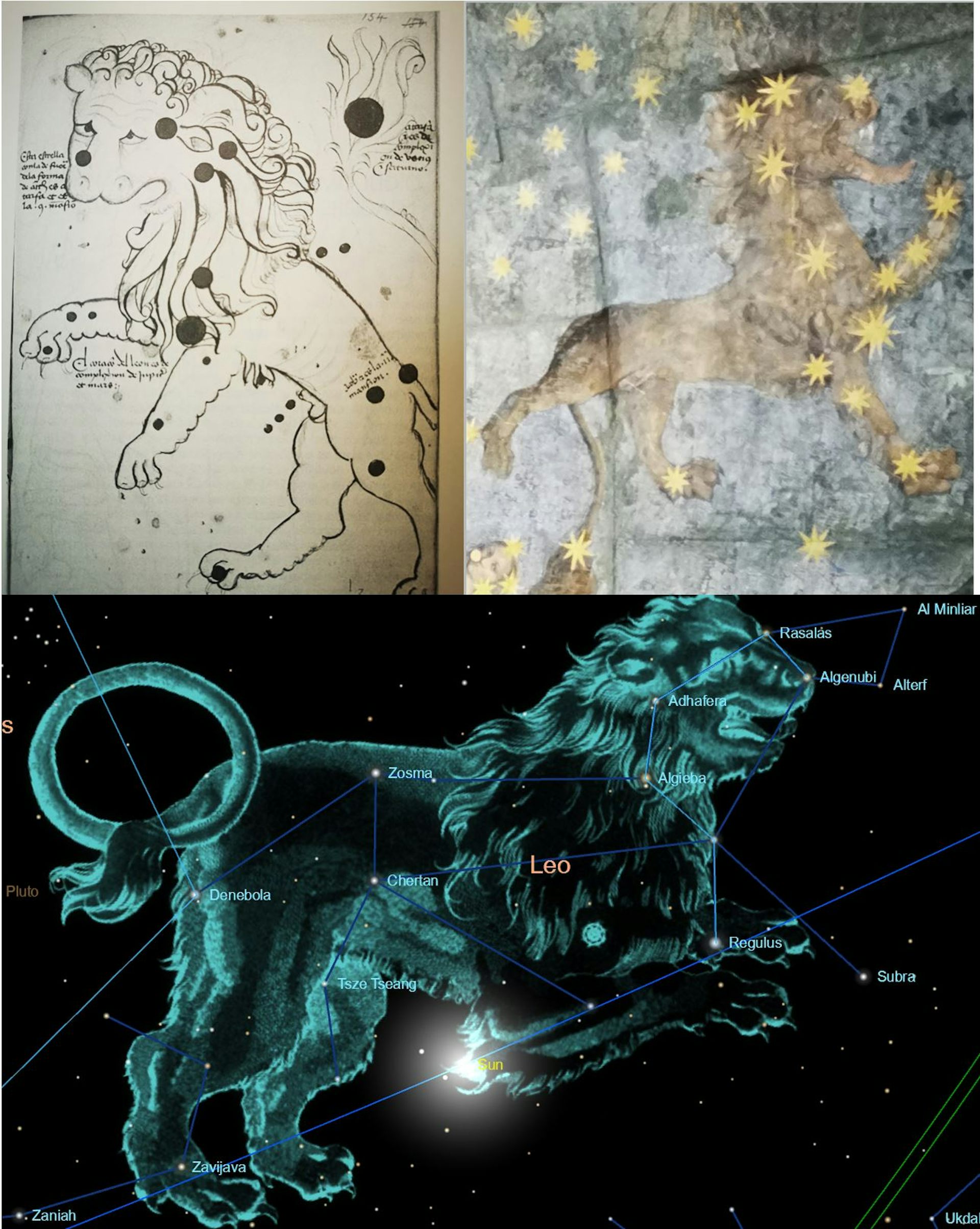 Representación de Leo según las Tabulae ad meridianum Salmantinum, en la bóveda y simulado para 1475-08-18.