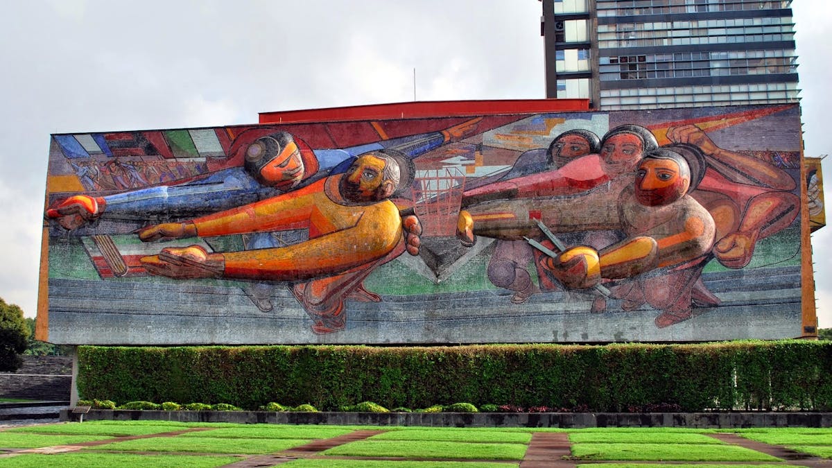 Escultopintura “El pueblo a la universidad, la universidad al pueblo. Por una cultura nacional neohumanista de profundidad universal”, obra de David Alfaro Siqueiros en la rectoría de la Universidad Nacional Autónoma de México (1952‑1956).