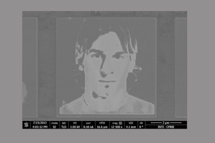 Messi a escala nanométrica. El Laboratorio de Micro y Nanoelectrónica del Bicentenario del INTI (CMNB) logró la imagen a escala nanométrica más pequeña del rostro de Messi, diez veces menor al grosor de un cabello. Mide 10 por 10 micrómetros con un espesor de 50 nanómetros.