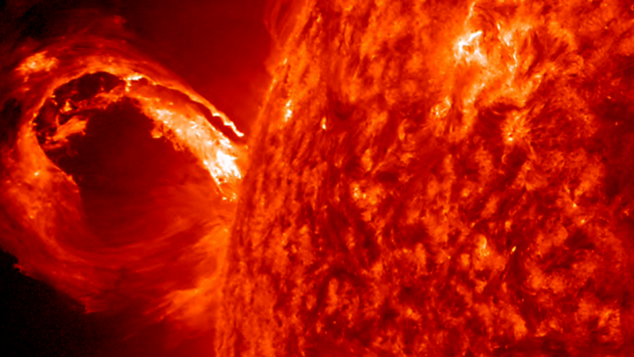 Las tormentas solares son erupciones de materia y radiación concentradas en una pequeña región de la atmósfera solar. Estas expulsiones de materia producidas por el Sol tienen una velocidad determinada y no es siempre la misma porque dependen de la violencia con la que el sol las eyecta.