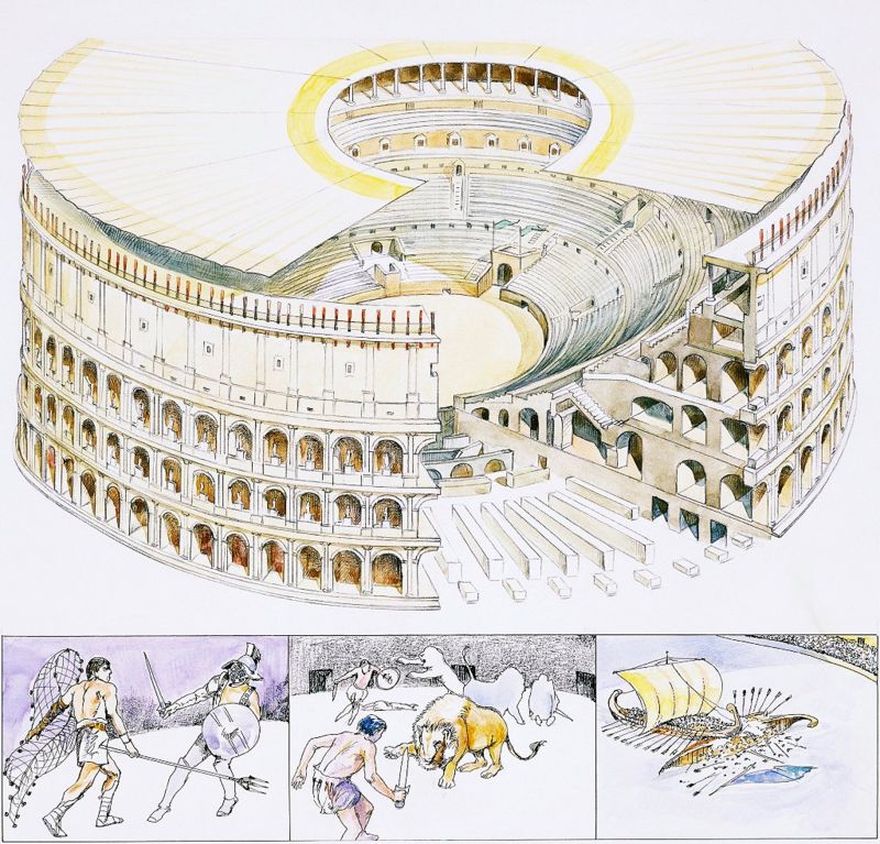 El Coliseo de Roma reconstruido, con representaciones de combates de gladiadores o ‘munera’, de gladiadores y animales o ‘venationes’ y navales o ‘naumachiae’.