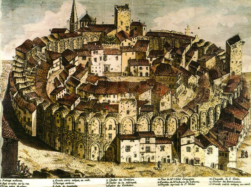 El anfiteatro antes de que se destruyeran las casas. (J.B. Guibert, siglo XVIII)