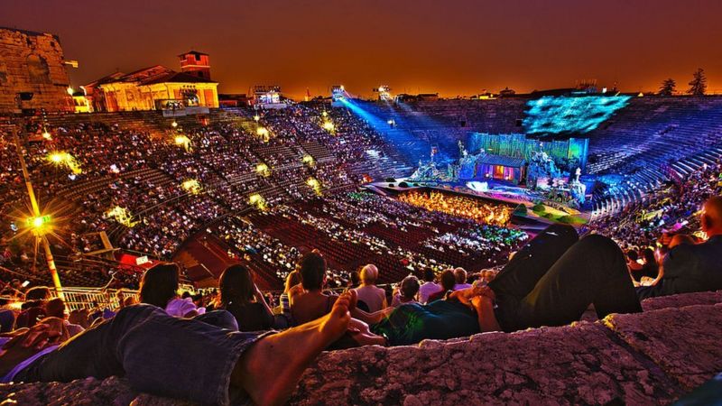 Por su impresionante acustica, es el hogar del Festival de Verona, al que los espectadores llegan para escuchar óperas que empiezan al atardecer sentados en los antiguos asientos de piedra y prendiendo velas cuando cae la noche.