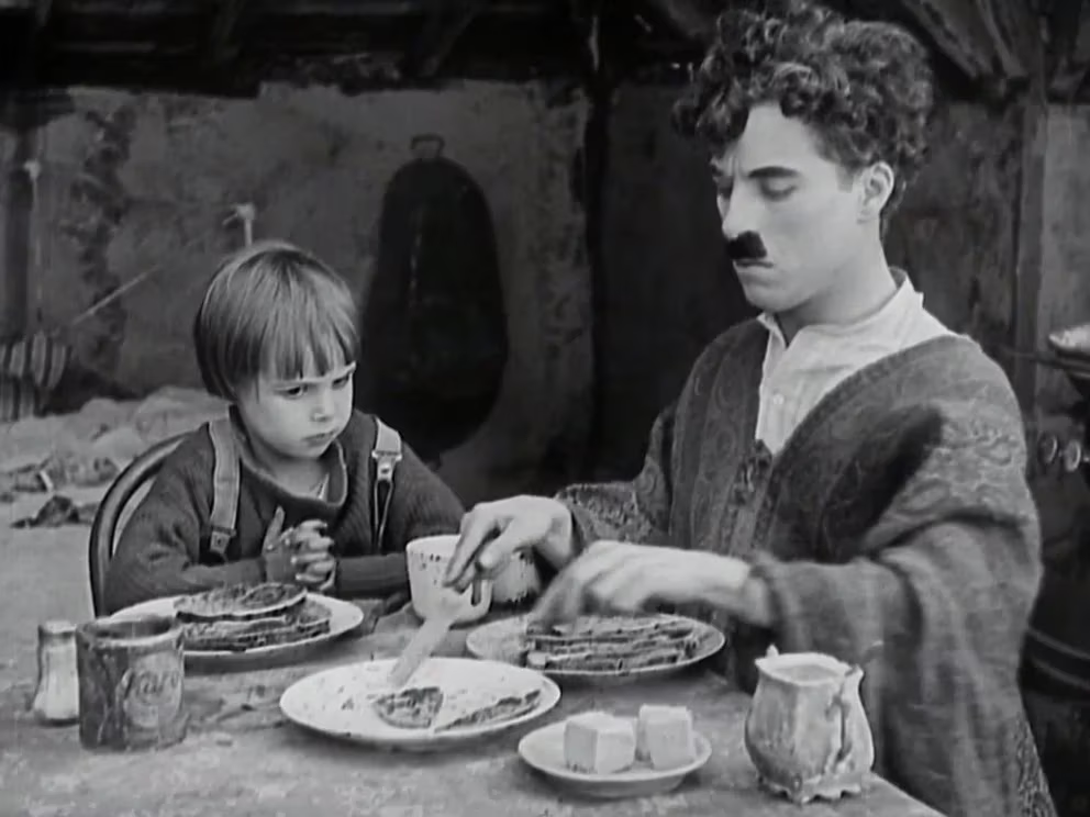 Ambos aparecen en la secuencia en que el vagabundo se encuentra con el chico, donde el humor le gana el espacio a la tragedia.