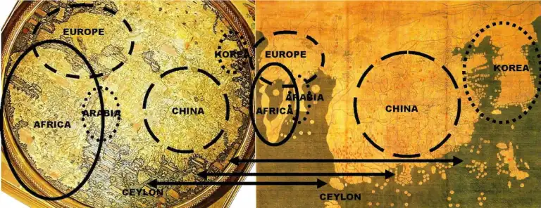China y Corea aparecen en el mapamundi de Fra Mauro mucho más pequeñas que Europa y África, pero muy similares en descripción a otra probable fuente: el mapa Kangnido, hecho en 1402 invirtiendo los tamaños y explicando también lo protagonizado por el mencionado almirante chino.