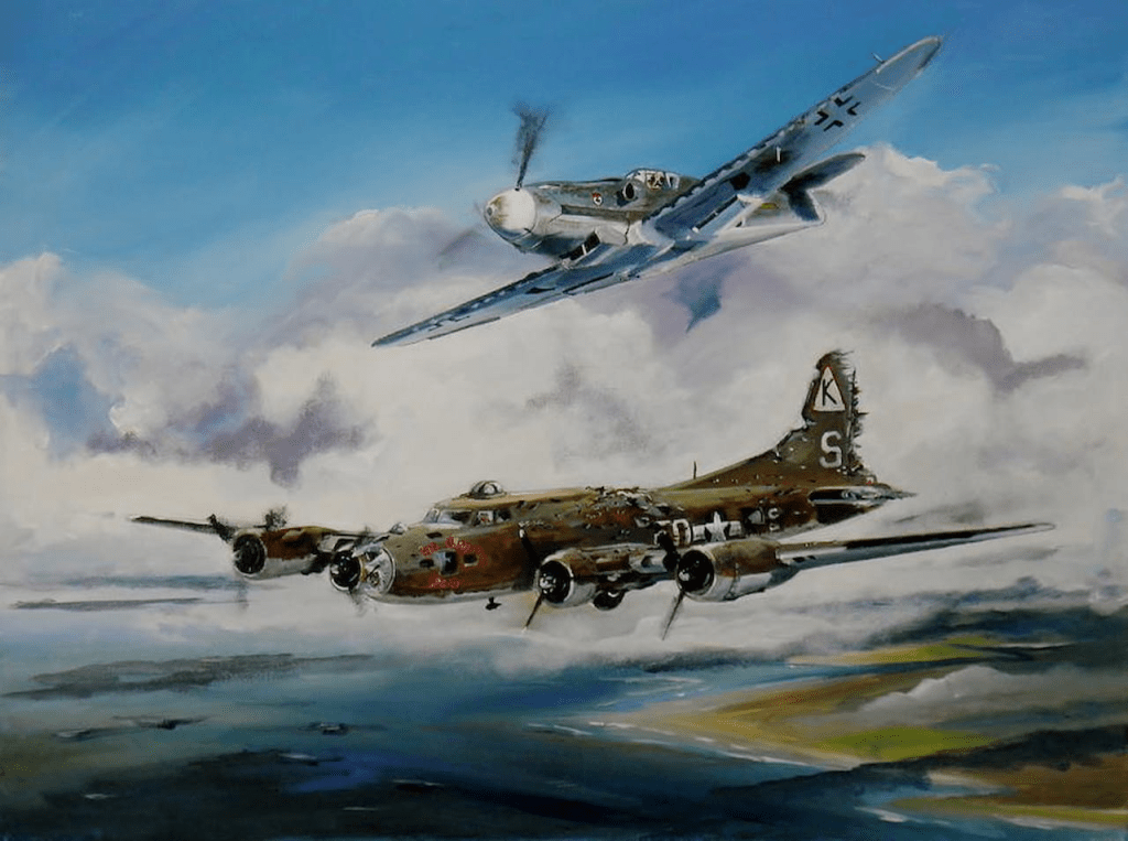 Entonces, dado que los eventuales antiaéreos seguían haciendo fuego sobre el avión americano, el Messerschmitt Bf 109 G-6 se situó a su lado de babor para escoltarlo, volando así hasta que dejaron el espacio aéreo alemán y salieron al mar del Norte.