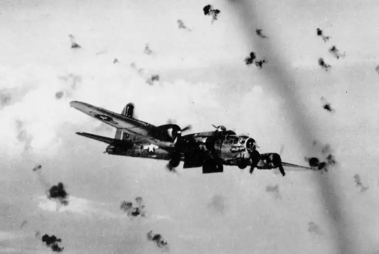 Se disponía a soltar las bombas desde una altitud de 8.320 metros cuando el B-17 resultó alcanzado por una andanada que le destrozó el morro acristalado (de plexiglás, en realidad).
