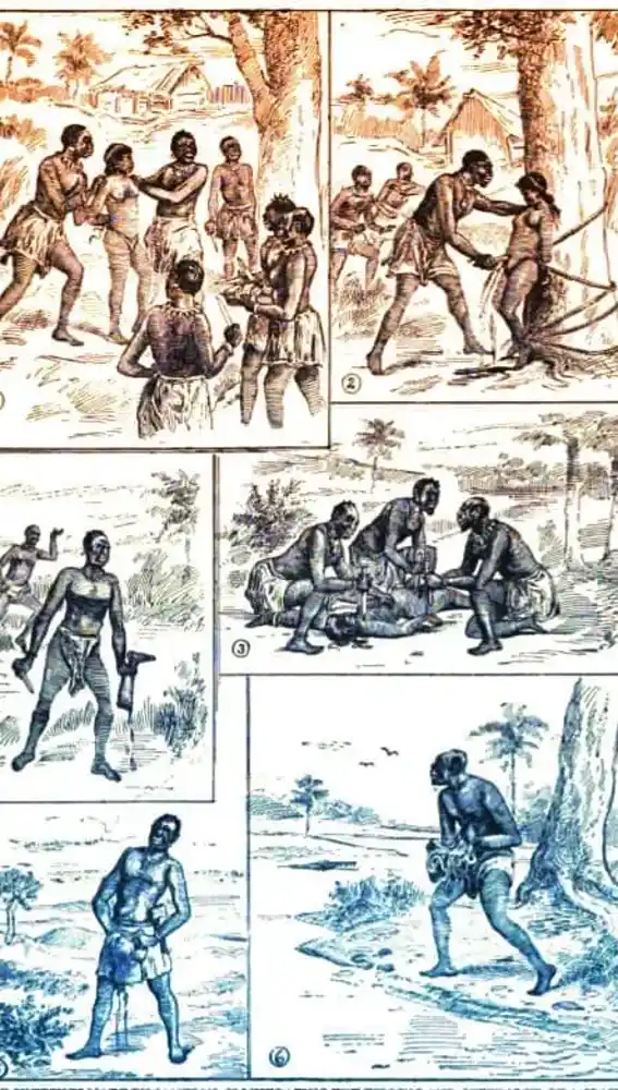 Descrito por los dos testigos el macabro espectáculo, consistió en que, mientras algunos nativos afilaban sus cuchillos, otros ataban a la joven a un árbol.