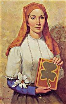 Curiosamente, aunque la leyenda hace a la santa irlandesa, en Irlanda no hay rastros de su devoción hasta el siglo XVI, cuando la importan desde el continente.
