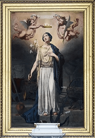 El 25 de mayo de 1802, mientras se llevaban a cabo excavaciones arqueológicas en las catacumbas de Santa Priscila, en la Vía Salaria de Roma, se encontró una cripta sellada con tres losas de terracota; estaba rodeada de símbolos que presuntamente aludían al martirio y a la virginidad de la persona ahí enterrada; los símbolos eran: ancla, tres flechas, una palma y una flor.
