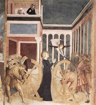 El emperador ordenó entonces que torturaran a Catalina utilizando para ello una máquina formada por unas ruedas provistas de unas cuchillas afiladas.