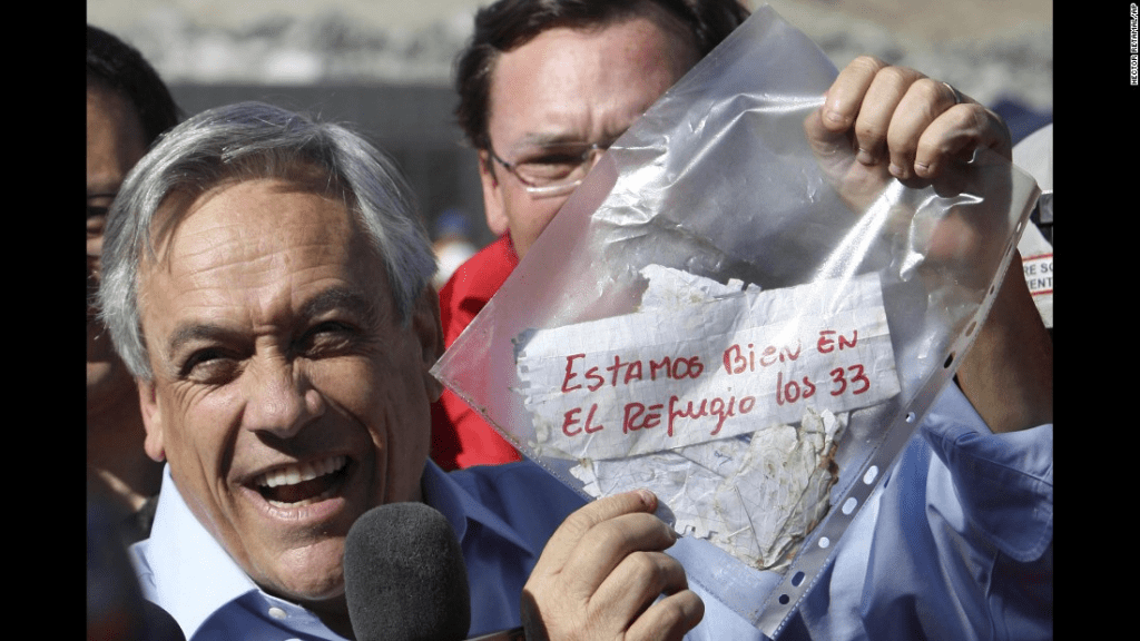Sin embargo, el 22 de agosto de 2010, el mundo supo que los hombres seguían vivos luego de que una herramienta de perforación saliera de las profundidades con una nota adherida a ella. La nota indicaba que los 33 hombres estaban vivos.