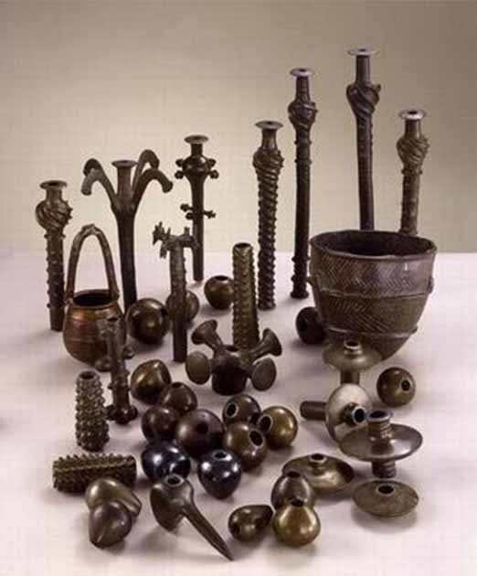 Los 442 artefactos preciados hechos de cobre, bronce, marfil y piedra incluyen 240 cabezas de maza, 100 cetros, 5 coronas, cuernos de pólvora, herramientas y armas.