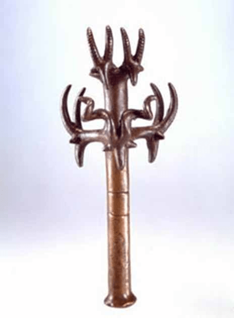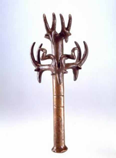 Algunos de estos objetos son como nada que se haya visto en ningún otro lugar. Por lo general, se dice que las perillas redondas son cabezas de maza, pero no hay evidencia de que alguna de ellas se haya usado alguna vez en combate. Los objetos restantes son aún más inusuales y de estilo único, como el cetro de bronce que se muestra a continuación.