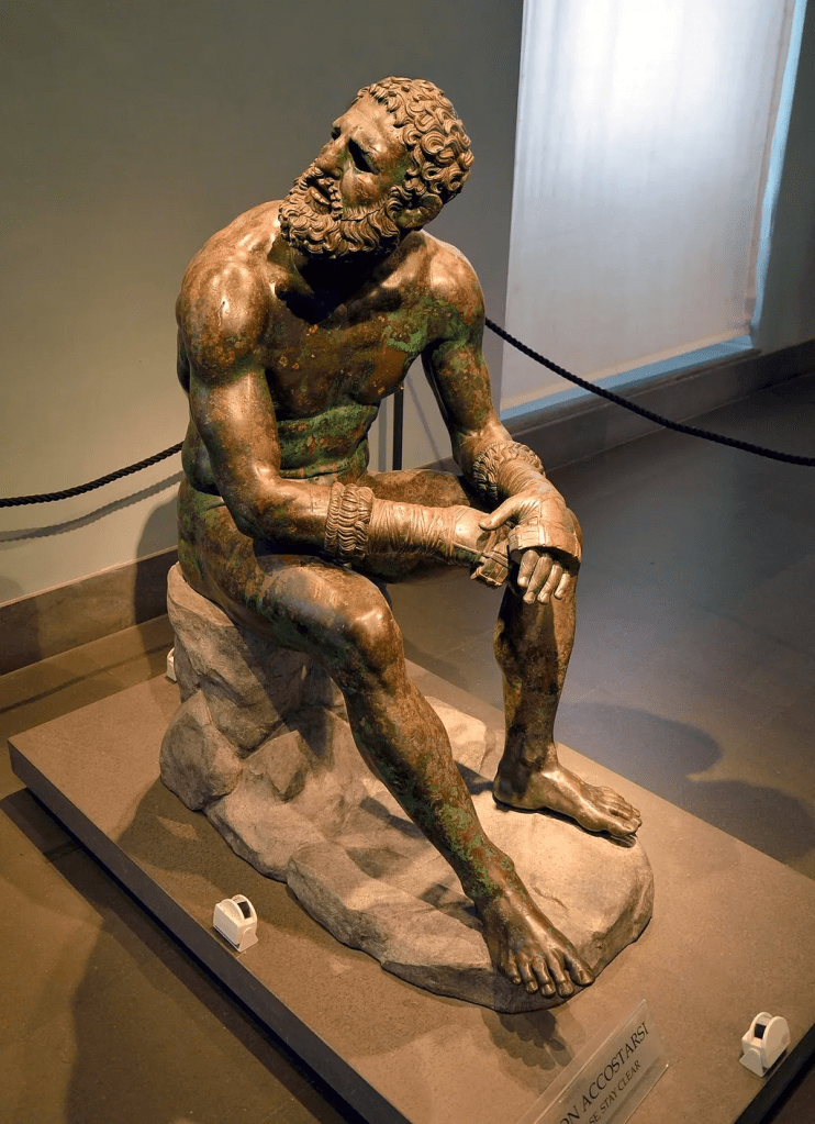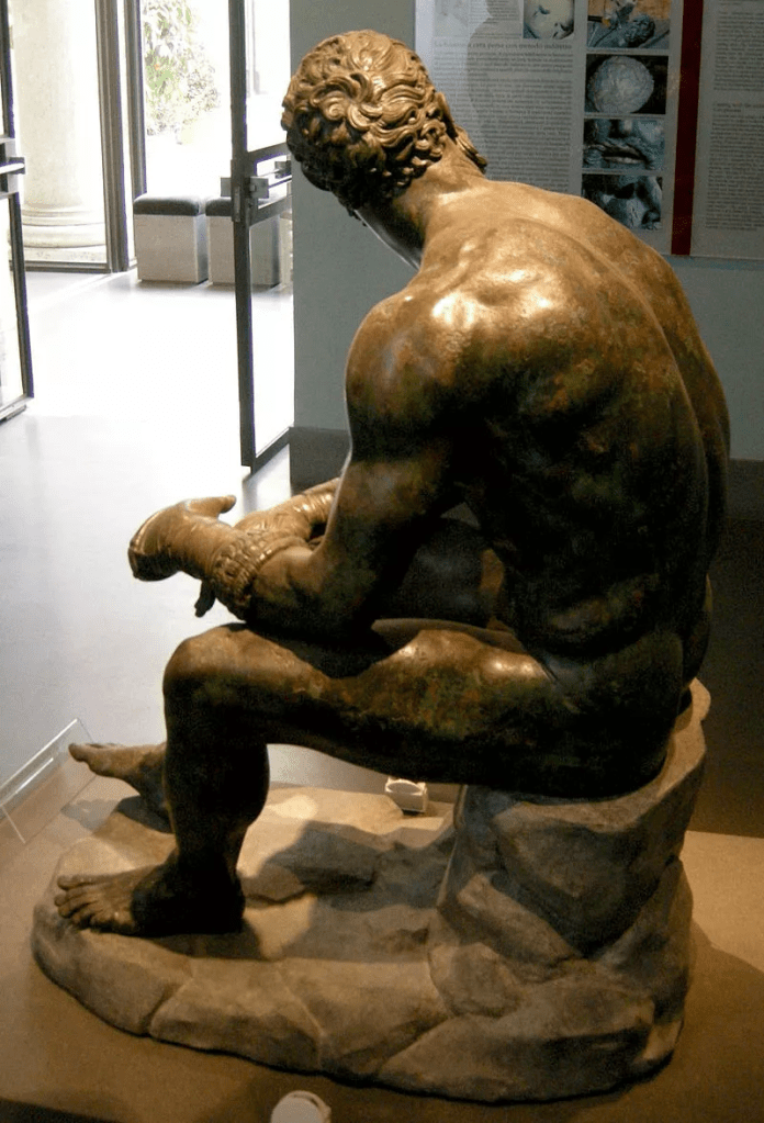 (F.R.S.Pardo) — Museo Palazzo Massimo alle Terme, Roma (Italia) – Otro día más en la oficina, otro combate más. Delate de nosotros tenemos la representación de un púgil, de un atleta o un trabajador del deporte. Sentado, agotado, intenta recobrar el aliento y gira la cabeza mostrándonos su espeluznante rostro. Lleva un taparrabos y unos guantes, un poco random, que era lo que había hace más de dos mil años.
