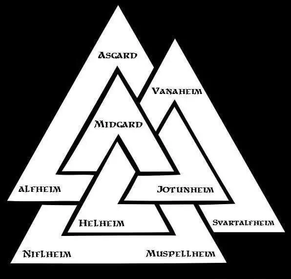 Mientras que los tres triángulos representan las tres raíces del árbol, los puntos se refieren a los Nueve Mundos de la religión Ásatrú: