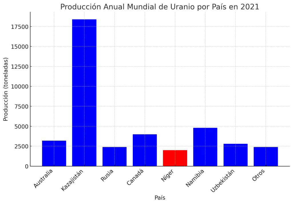Níger produce el 5% del uranio mundial, lejos del 46% que aporta Kazajistán. Con todo, Níger es uno de los mayores productores de uranio en el mundo, además de tener una importancia clave para Europa, dado que el Viejo Continente es uno de los principales clientes de Níger en este mercado. Su riqueza en uranio se encuentra principalmente en la región de Agadez.