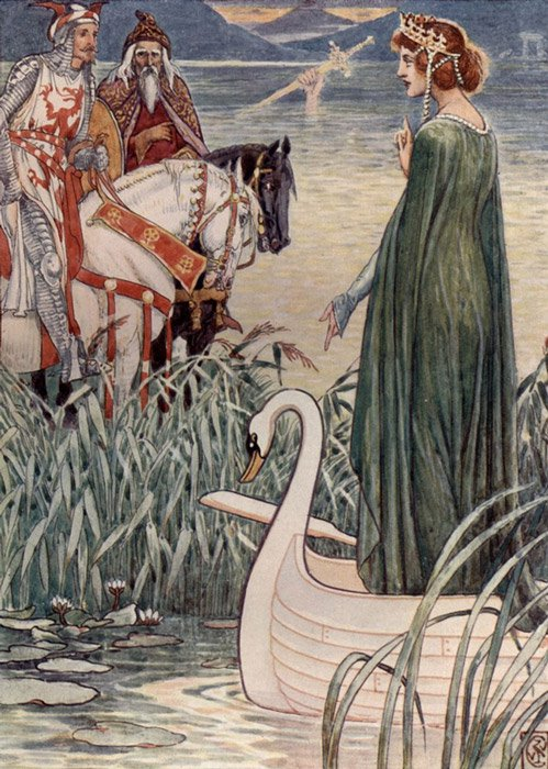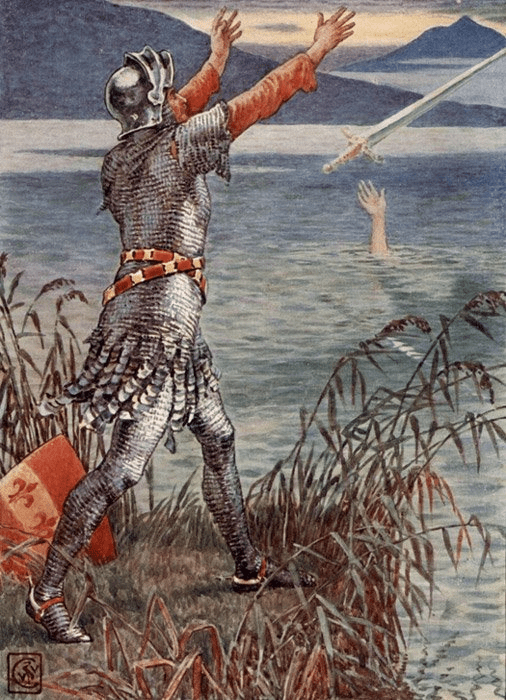 Y cuando el rey finalmente yace moribundo en el campo de batalla, Excálibur es arrojada a una laguna encantada donde la Dama del Lago la empuña para acto seguido arrastrarla consigo hasta el fondo bajo las aguas.