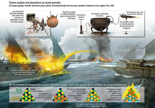 El fuego griego era un arma incendiaria utilizada por el Imperio bizantino.