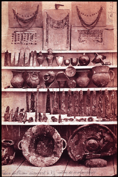 En esta búsqueda alcanzó en 1873 un gran hallazgo: una vasija de cobre que contenía una colección de joyas que las denominó como «El tesoro de Priamo», cuyas joyas puso sobre su esposa, Sofía Engastromenos.