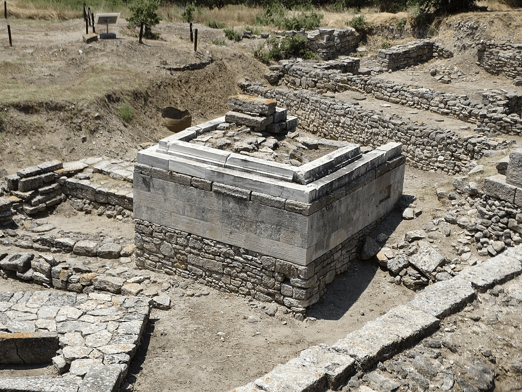 Descubierta por Schliemann, estaba constituida por un recinto de murallas fortificadas de piedras, de 2,50 m. de grosor, probablemente con bastiones cuadrangulares.