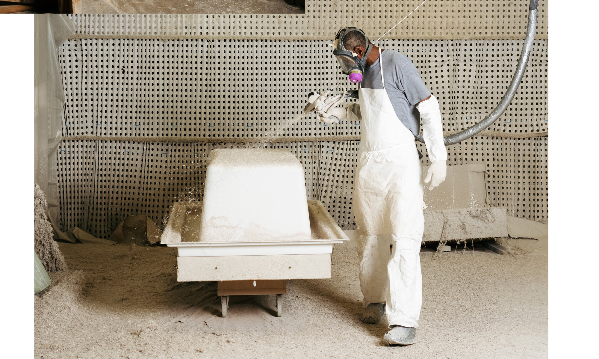Tenemos de 70 a 80 modelos diferentes de bañeras”, dijo Aaron Patillo, el ingeniero jefe de planta, quien tuvo que hacer un esfuerzo por hacerse oír por encima del rugido de las máquinas. «Por lo general en un día cualquiera estaríamos fabricando 12 tipos, dependiendo de la demanda”.