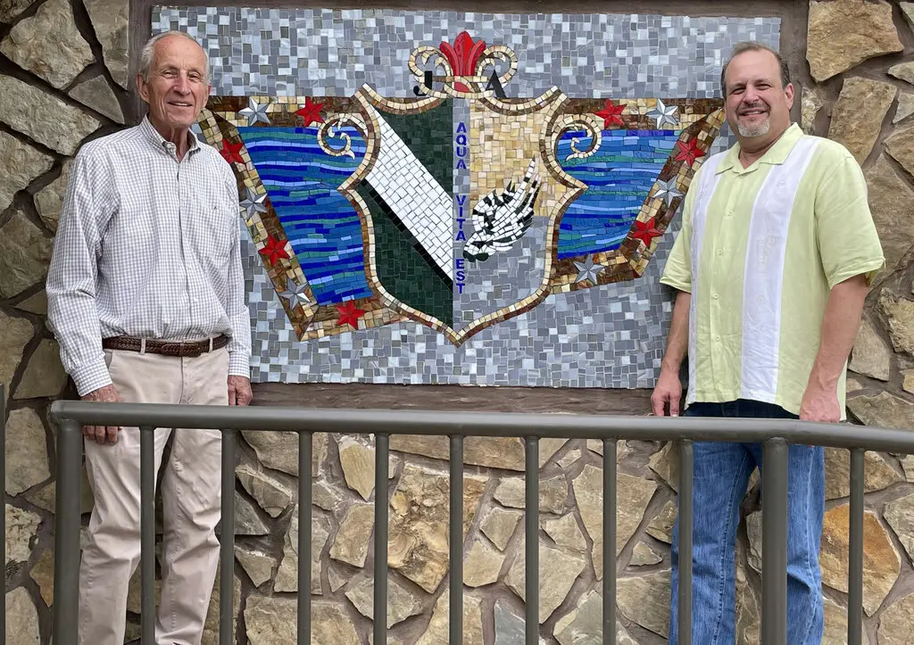 En la pared al lado de la puerta de entrada se encuentra un colorido mosaico del escudo de la familia Jacuzzi. Atravesando su centro, casi como una columna vertebral, se puede leer su autoproclamado lema: Aqua Vita Est. (El agua es vida.)