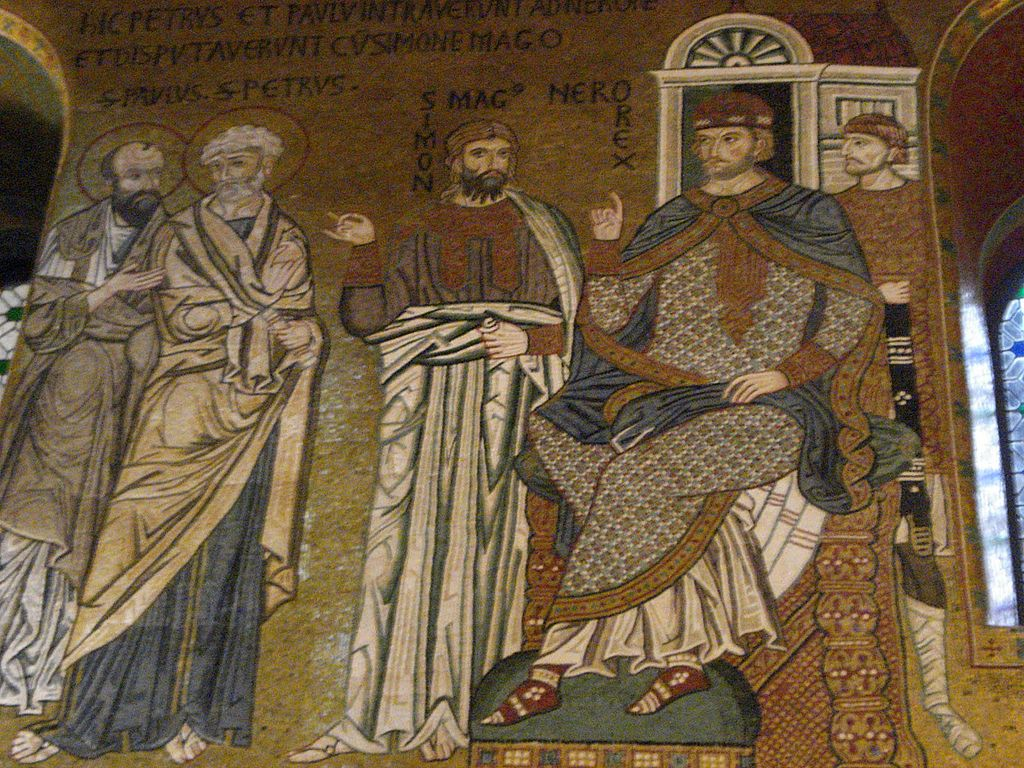 Según la leyenda, en un intento de demostrar sus habilidades mágicas al Emperador Nerón (54 – 68 d. C.), Simon voló por los aires con ayuda de un conjuro, que fue roto por obra de Pedro, causando la caída de Simón y su muerte.