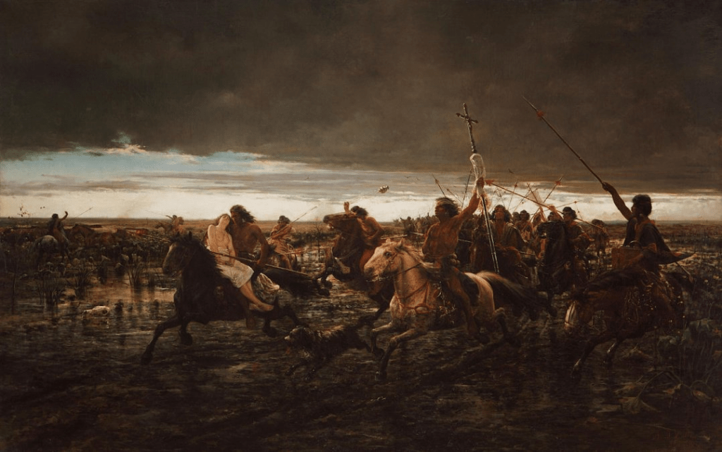 Lo mismo que una portada de una revista estadounidense de fines del siglo XIX que muestra a un apache raptando a una mujer blanca, se pueden apreciar estas escenas en los cuadros de Juan Mauricio Rugendas que representan mujeres raptadas o que tratan de rescatar de sus captores (mediados del siglo XIX); y aunque para la época que Ángel della Valle pinta su obra “La vuelta del malón” ya se ha acabado el llamado “problema indio” en la Argentina de 1892, este artista plasma una situación similar con una mujer blanca desfallecida y semidesnuda en los brazos del indio que la sostiene mientras cabalgan y uno de sus compañeros lleva una cruz como parte del botín.