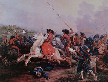 «La guarnición de Salto era de 40 hombres, que podía hacer frente a las lanzas, pero no a lo fusiles; terminó capitulando, bajo la condición de respeto a las vidas. La mayoría del vecindario había buscado refugio en la iglesia del pueblo. Los indios hicieron saltar el portón de entrada a golpes de ancas de caballo, y las paredes del recinto sagrado resultaron inútiles para contener la marea de la violación, el expolio y el degüello».
