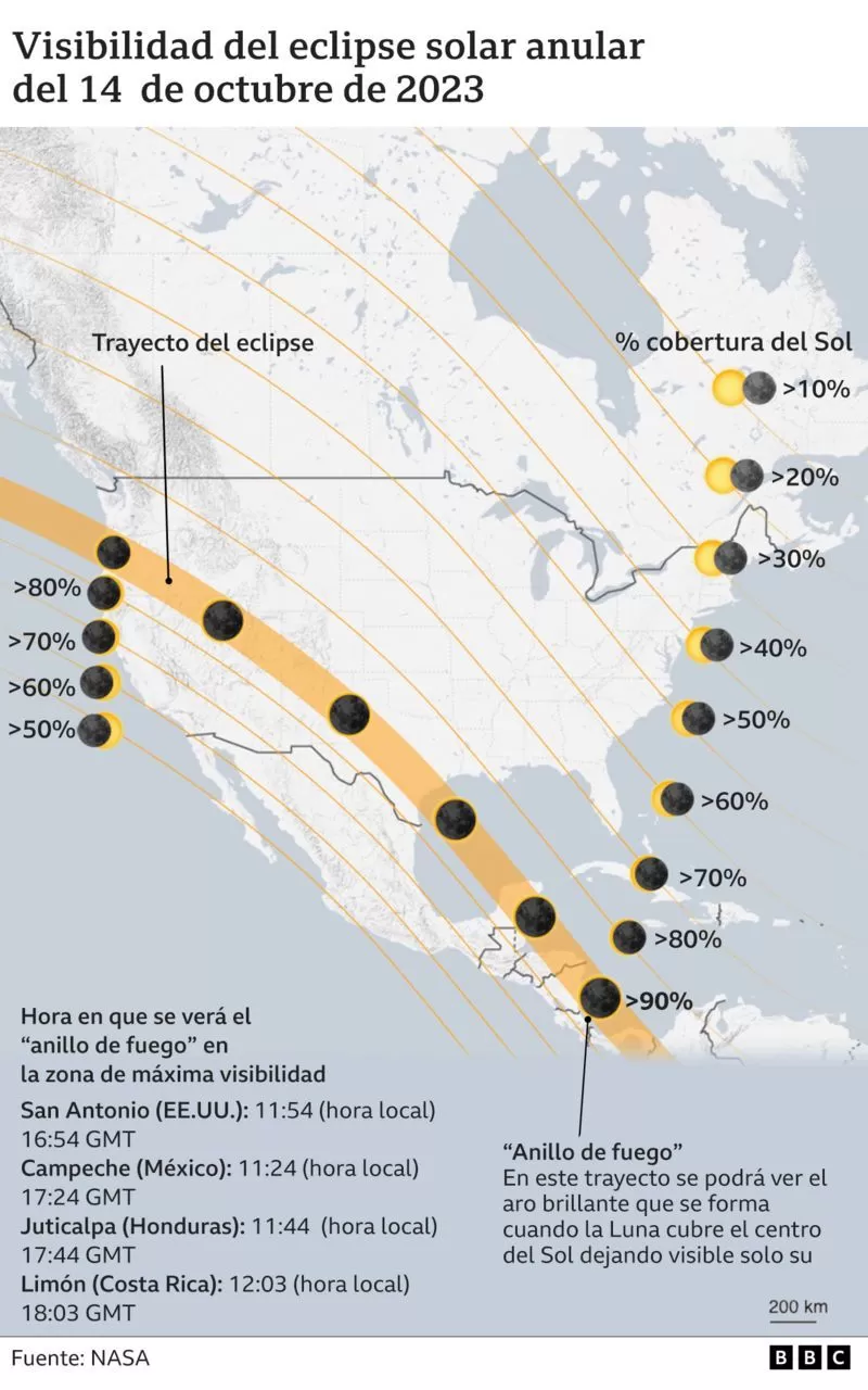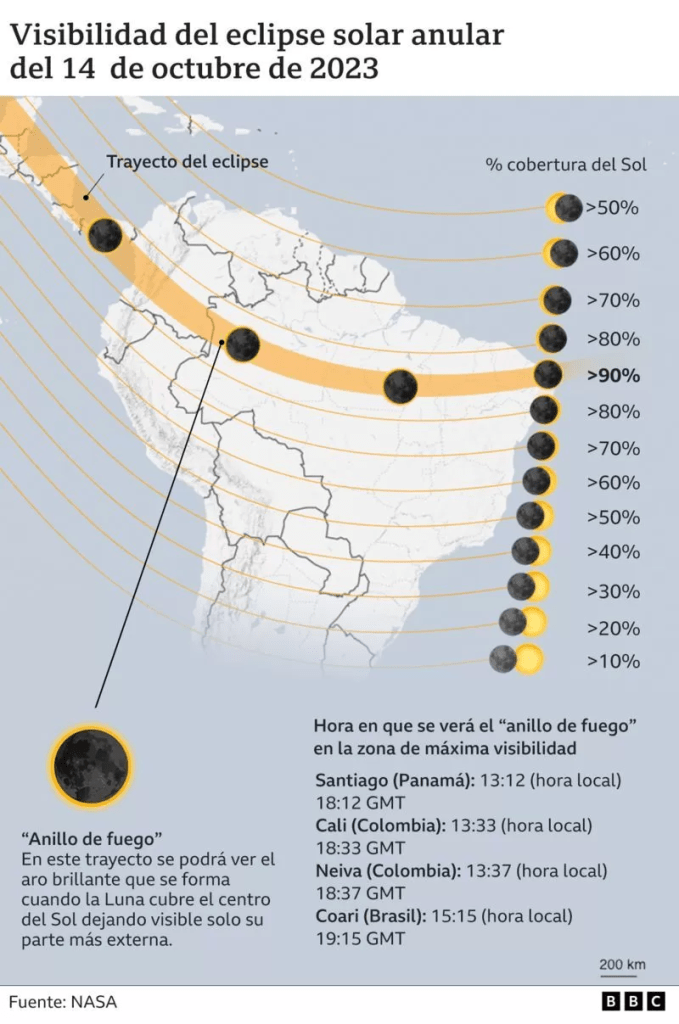 Partes de la América presenciarán un eclipse solar anular este pasado sábado 14 de octubre, conocido como de «anillo de fuego», que ocurre cuando la Luna no llega a ocultar completamente el Sol.