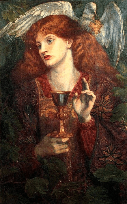 Precedida por unos pajes que portaban una lanza y dos candelabros encendidos y seguida por otra joven dama con una bandeja de plata, aparece una hermosa doncella que sostenía el grial de oro entre sus manos. Con él se ilumina completamente la estancia.