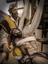 Tras la muerte de Jesús, José de Arimatea, uno de sus discípulos que podemos calificar de secreto, pues no aparece referido en los Evangelios sino hasta este momento, solicita el permiso de Pilatos para recuperar el cuerpo crucificado de Jesús y darle sepultura. Momento éste en el que se le entrega el cáliz de la Ultima Cena y del que se servirá para recoger la sangre que emana de sus heridas.
