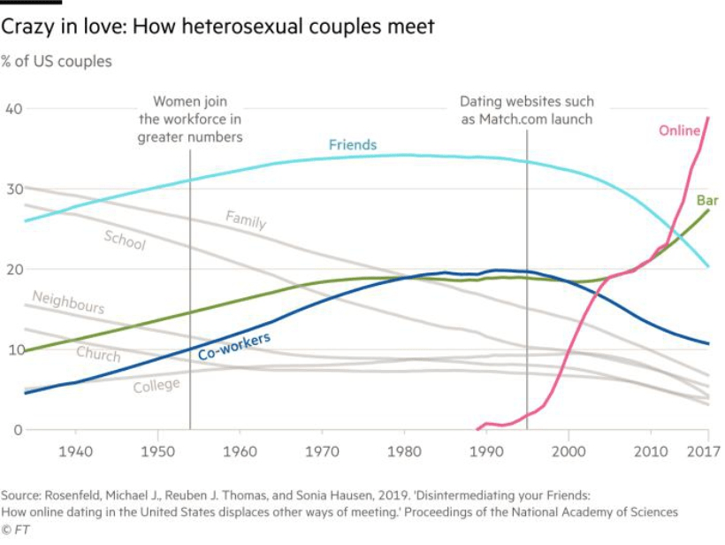 Y, sin embargo, Tinder funciona. Los datos de Rosenfeld para Estados Unidos (2019) indican que un 40 % de las parejas heterosexuales se conocen por internet en 2017. Para minorías sexuales el porcentaje es bastante mayor, ya que el entorno online les permite protegerse parcialmente de los peligros de la discriminación.