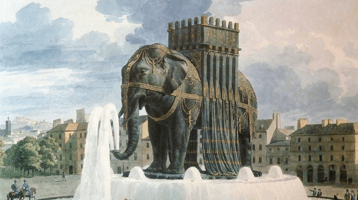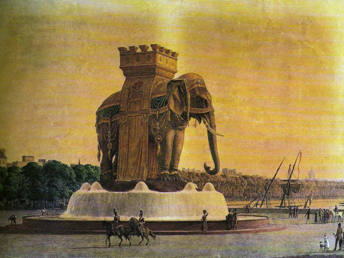 Este proyecto fue ordenado por Napoleón en 1808, con la idea de regenerar urbanísticamente la ciudad y de honrar sus victorias de algún modo. Se trataría entonces de una estatua colosal de un elefante que, al más puro estilo indio, llevaría un howdah (es decir, una silla de madera con dos compartimentos) en forma de torre.