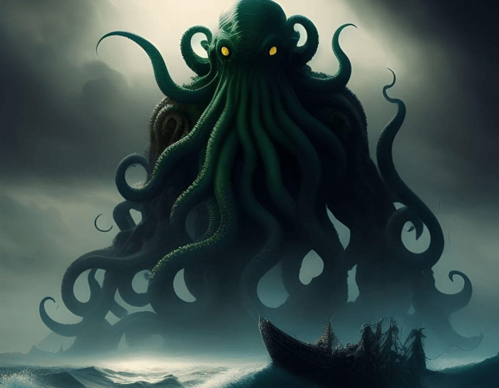 Eso y las coordenadas geográficas provocaron las bromas sobre Cthulhu despertando o bostezando en su ciudad sumergida de R’lyeh, ya que, si bien su autor nunca lo describió con detalle, el primigenio lovecraftiano suele representarse como una entidad colosal, una mezcla de pulpo y dragón con forma vagamente antropoide, más alto que cualquier edificio.