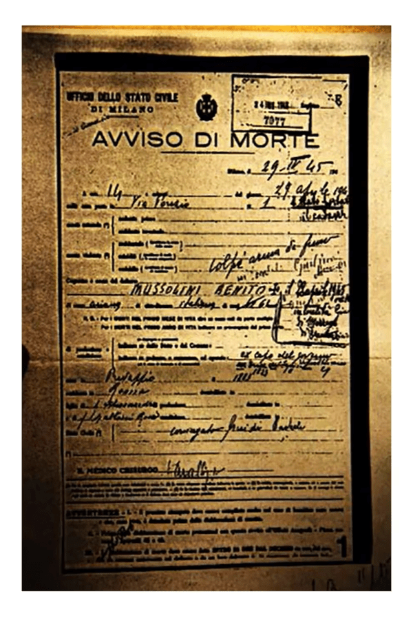 Allí la amante del Duce es ingresada en el registro del obituario con su nombre de nacimiento, Clarice Petacci, y anotada con el número 166. Mussolini es registrado un renglón más abajo del libro, con el número 167. Al día siguiente, el 30 de abril, por la mañana, el cuerpo de Mussolini es sometido a una autopsia por decisión de los dirigentes partisanos.