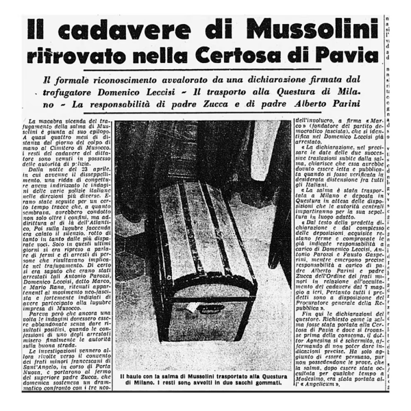 Presionado por la policía, uno de los detenidos, Muggiani, brinda los nombres de dos hombres de la Iglesia y dice que están involucrados en el asunto de la desaparición del cuerpo de Mussolini. Se trata de los padres franciscanos Enrico Zucca, prior del Convento di piazza Sant’Angelo de Milán, y el padre Alberto Parini.